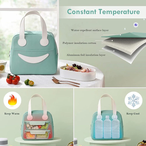 El bolso está hecho con algodón perlado y lámina de aluminio, que es conocido por su excelente aislamiento de aire y retención de temperatura, manteniendo tu comida fría/caliente durante horas. El interior es repelente al agua y a la grasa, por lo que un simple paño húmedo puede limpiar fácilmente