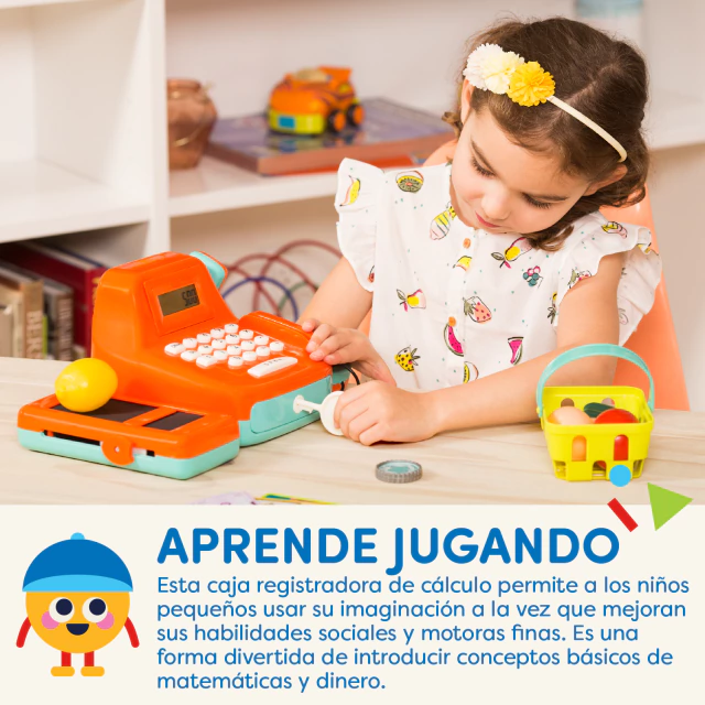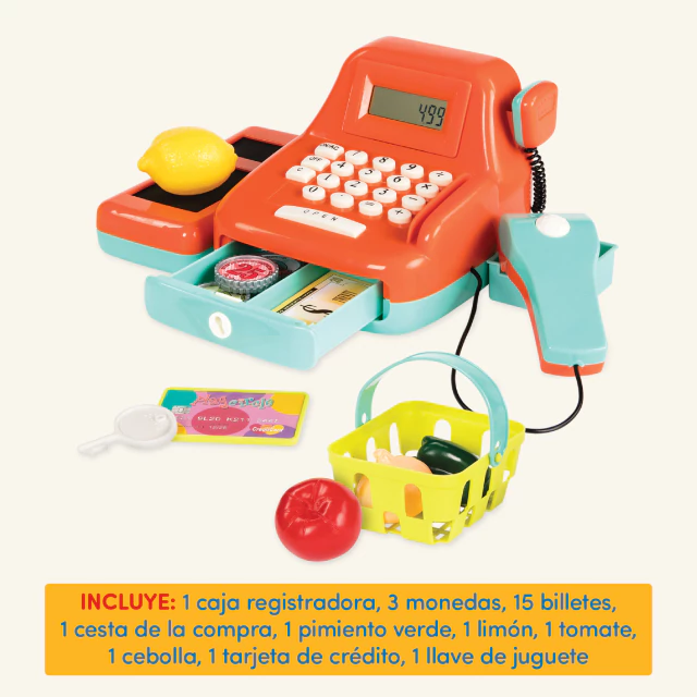 Este juego de caja registradora de juego de simulación es perfecto para manos pequeñas y grandes imaginaciones. 1 limón… ¡BIP! 1 cebolla… ¡PIP! “¡Será un gran total de 2,50!” ¡Cha-CHING! Escuche divertidos pitidos cuando utilice el escáner iluminado y el típico Ding! cuando abres el cajón del dinero. Hay muchísimas funciones divertidas en la caja registradora de juguetes de este niño. Toma el micrófono imaginario para anunciar las especialidades del día o marcar el total: ¡la caja registradora también funciona como una calculadora real! Viene con dinero ficticio, accesorios divertidos y sonidos interactivos. ¡Jugar con la caja registradora Battat es como ser un auténtico comerciante!