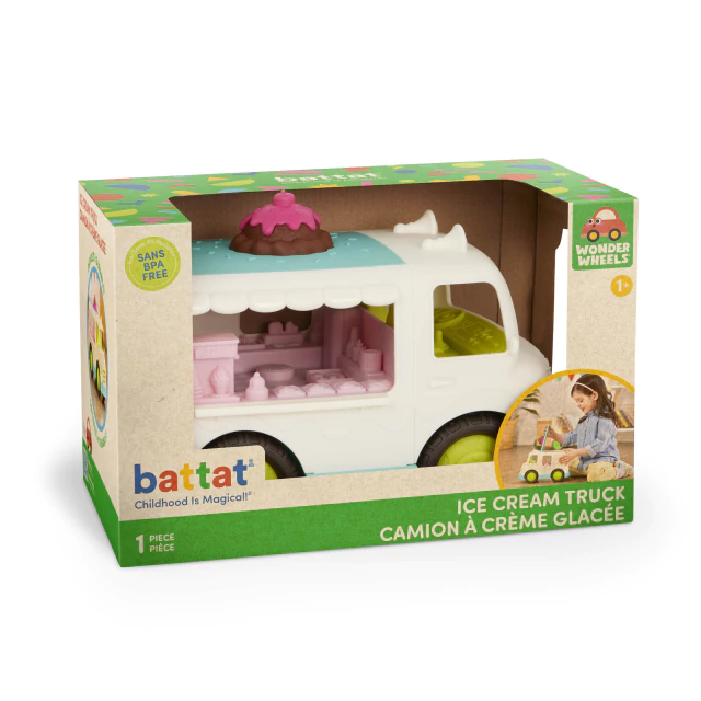 ¡El camión de helados de juguete By Battat para niños está aquí! Hay toda una heladería sobre ruedas para descubrir cuando levantas el techo. Y, sus clientes no tendrán problemas para ordenar desde una de las 3 grandes ventanas abiertas. ¡Hay espacio en la parte delantera para un pequeño personaje de juguete, y una linda bola de helado de chocolate en el techo! ¡Los vehículos y autos de juguete Wonder Wheels by Battat fomentan el juego de simulación y la diversión! Recomendado para pequeños vendedores de helados de 1 año en adelante.