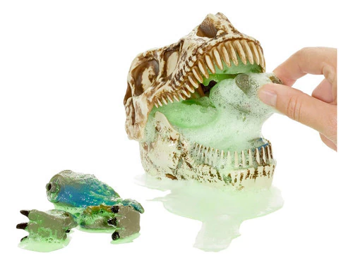 Agrega agua y observa cómo el dinosaurio forma espuma por la boca. Luego, abre sus mandíbulas y excava las piezas ocultas para armar tu propio dinosaurio.