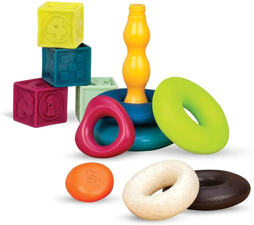 ¡Apile, exprima, mastique y juegue todos los días con el juego One Two Squeeze and Stacking Stones Set ™ de B. toys! Este colorido juego de 17 piezas viene con horas de diversión y muchas oportunidades de aprendizaje para su bebé. Cada bloque texturizado presenta 6 diseños esculpidos a mano (¡eso es 60 lados de diversión sensorial!), Mientras que cada anillo tiene la forma de un hermoso guijarro y tiene su propia textura. A su hijo no solo le encantará construir con bloques o anillos para apilar, sino que también descubrirá diferentes animales, observará colores vibrantes, aprenderá los números del 1 al 10, mejorará sus habilidades para resolver problemas y desarrollará su coordinación ojo-mano. . ¡Sin mencionar que todos estos juguetes están hechos de materiales sin preocupaciones y son fáciles de agarrar y jugar para manos pequeñas!