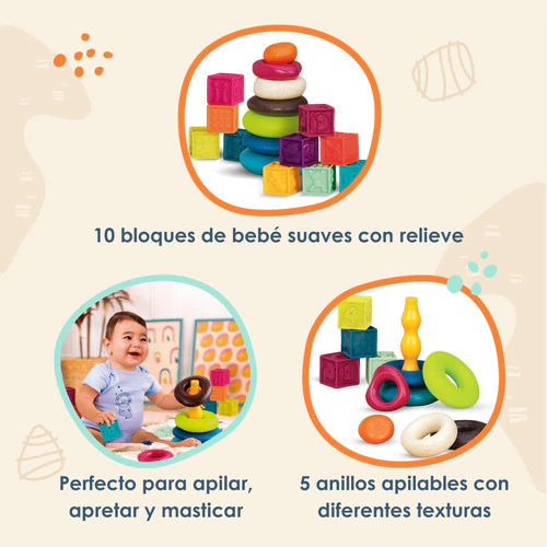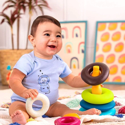 -Anillos de colores: ¡Un giro de apilamiento en un verdadero clásico, con 5 anillos texturizados para apilar y jugar!
