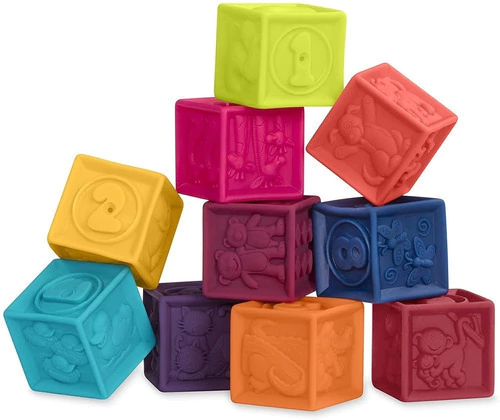 -Bloques de construcción: 10 bloques de construcción suaves y comprimibles para bebés y niños pequeños con hermosos colores y 60 diseños en relieve