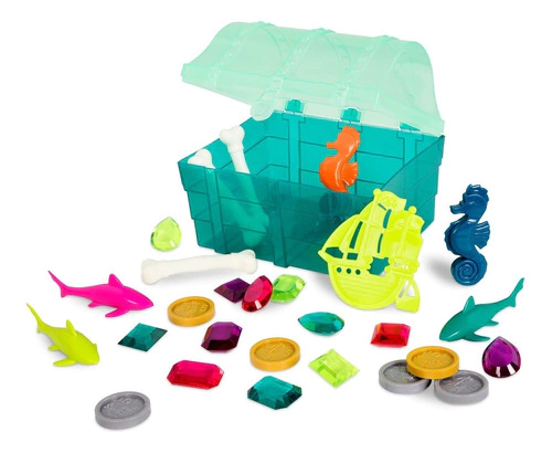 ¡Sumérgete en busca de botines hundidos con Treasures Ahoy! juego de juguetes B.! Desbloquea este cofre del tesoro para encontrar criaturas coloridas, gemas brillantes, monedas de oro y mucho más. ¿Estás planeando una fiesta en la piscina? ¡Desafía a tus amigos a una búsqueda del tesoro! Tira los juguetes a la piscina y mira quién puede reunir la mayor cantidad de artículos y devolverlos primero al cofre. Y si quieres llevarte los tesoros a la playa, todos los juguetes caben perfectamente en el cofre del pirata y son fáciles de agarrar sobre la marcha. Debido a que en B. tenemos en cuenta el medio ambiente, los padres también estarán felices de saber que nuestro empaque es 100% reciclable. Recomendado para niños a partir de 6 años.