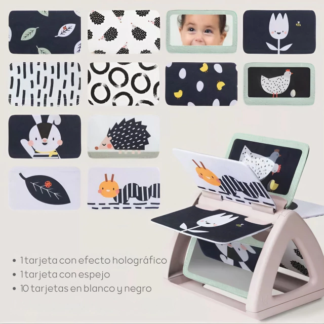 -Desarrollo cognitivo: incluye una página holográfica que despierta la curiosidad y promueve el desarrollo cognitivo mediante el reflejo y la exploración visual.
